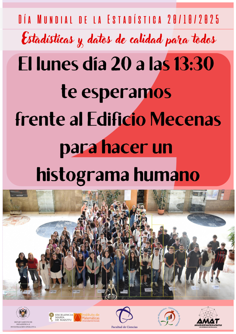 El día 20 de octubre de 2025 se celebra el Día Mundial de la Estadística, conmemoración propuesta por la ONU y que ocurre cada 5 años. Este año el lema es "Estadísticas y Datos de Calidad para Todos". Las Comisiones Docentes del Grado en Estadística y del Grado en Matemáticas, el Departamento de Estadística e I.O., la Facultad de Ciencias, el Instituto de Matemáticas IMAG, junto con la asociación de Estudiantes de Matemáticas y Estadística AMAT, han organizado una jornada de actividades para celebrar este día poniendo en valor la necesidad de la cultura estadística en la sociedad y la información a través de los datos como fuente de conocimiento y avance de la sociedad.