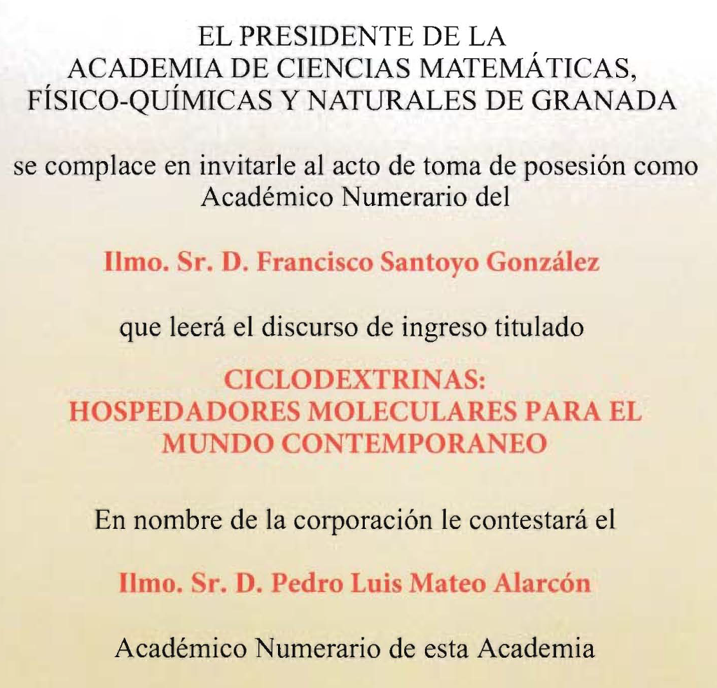 El próximo Viernes, 10 de noviembre de 2017 a las 18.30 horas en el Salón de Grados de la Facultad de Ciencias de la Universidad de Granada, en sesión extraordinaria de la Academia de Ciencias Matemáticas, Físico-Químicas y Naturales de Granada, el Prof. Santoyo González, catedrático de Química Orgánica de esta Universidad, va a pronunciar su discurso de ingreso, como miembro de número de la misma.